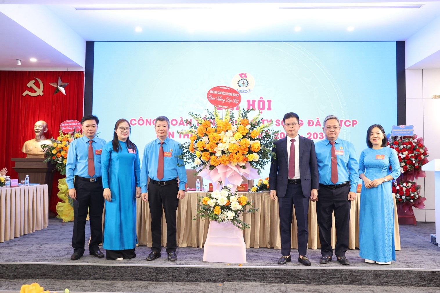 Đ/c Nguyễn Thanh Tùng và đ/c Trần Văn Tuấn tặng hoa chúc mừng Ban chấp hành công đoàn Tổng công ty Sông Đà nhiệm kỳ 2025 - 2030.