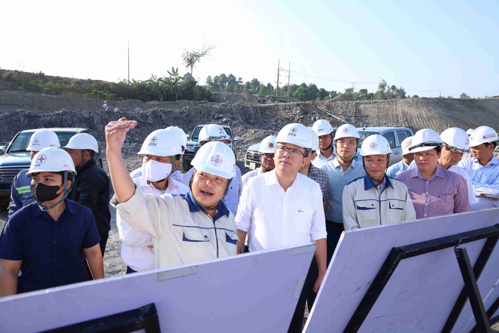 Dự án Nhà máy Thủy điện Trị An mở rộng sau khi hoàn thành sẽ giúp tăng khả năng huy động công suất cho phụ tải khu vực miền Nam, giảm chi phí sản xuất của hệ thống điện quốc gia, tận dụng tối đa khả năng của dòng chảy thông qua việc hạn chế lượng xả thừa hằng năm, giảm phát thải CO2, kéo dài tuổi thọ thiết bị của Nhà máy Thủy điện Trị An hiện hữu. Trong ảnh: Phó Tổng giám đốc EVN Phạm Hồng Phương cùng đoàn công tác nghe đại diện đơn vị thi công báo cáo tiến độ đào hố móng nhà máy.