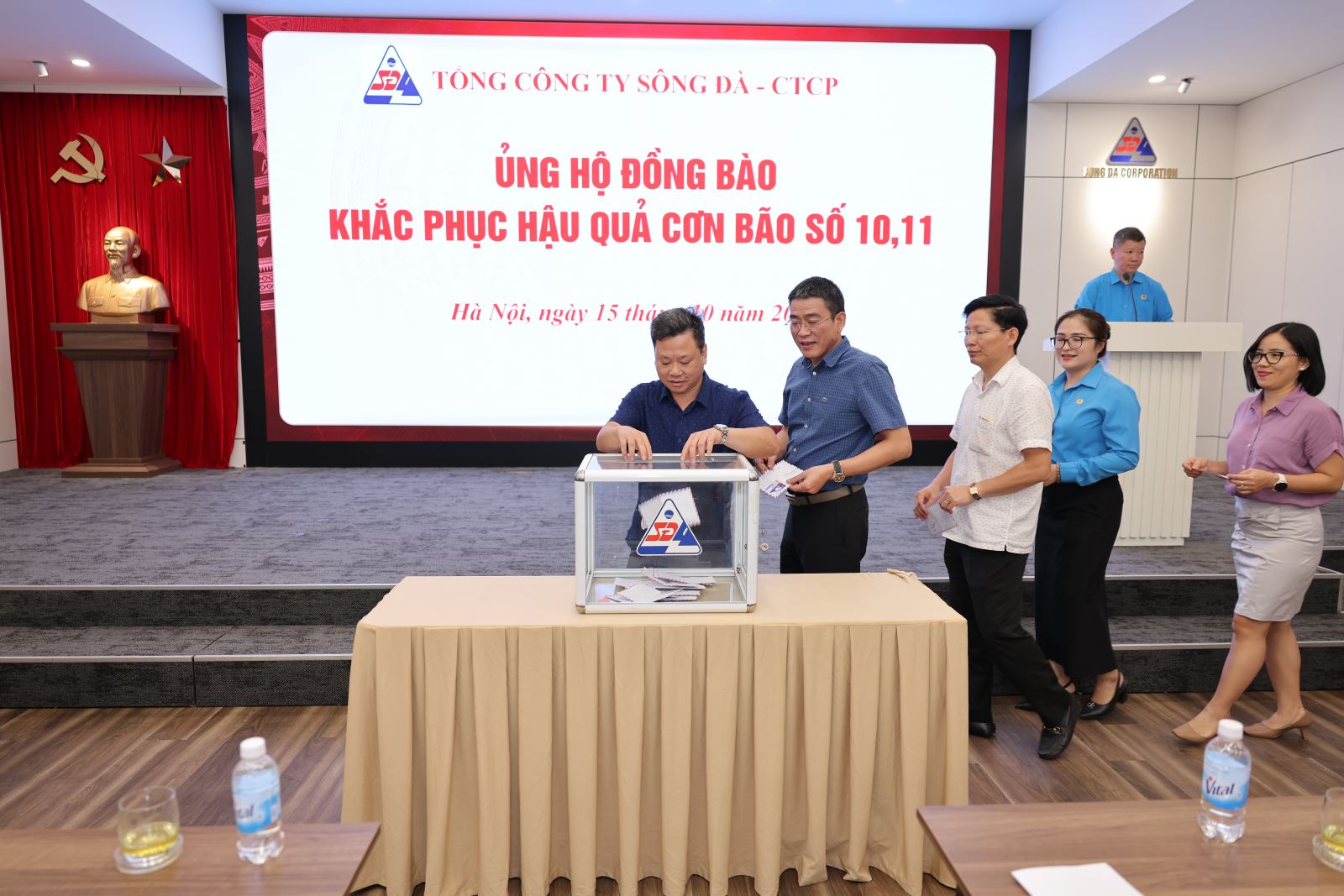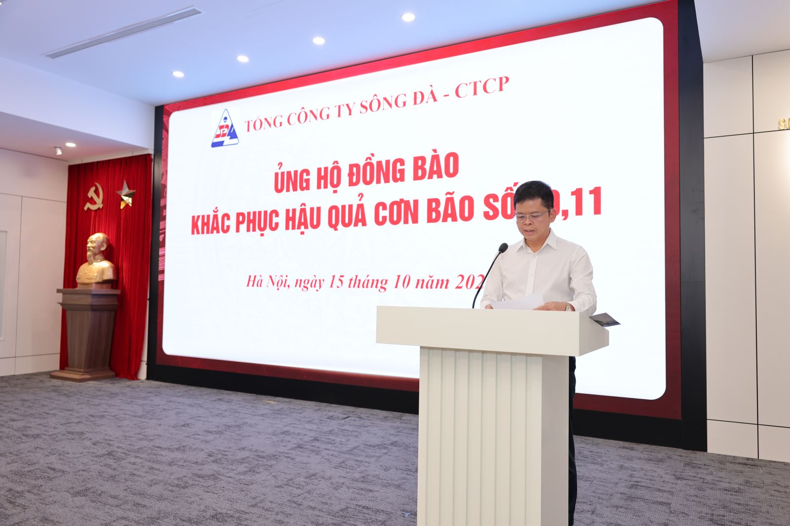Đồng chí Trần Anh Đức – Tổng giám đốc Tổng công ty đã phát biểu và ra lời kêu gọi các đơn vị và toàn thể CBCNV đang làm việc tại các công ty con, công ty liên kết, đơn vị có tổ chức đảng, đoàn thể chính trị trực thuộc tổ chức Đảng, Công đoàn, Đoàn TN Tổng công ty trên tinh thần đoàn kết, tự nguyện quyên góp, ủng hộ bằng tiền hoặc các vật dụng thiết yếu để hỗ trợ, giúp đỡ đồng bào các tỉnh miền Trung, miền Bắc và đặc biệt ủng hộ những CBCNV đang làm việc tại các đơn vị thành viên của TCT mà bản thân và gia đình bị thiệt hại nặng nề do đợt mưa lũ và bão số 10, 11 gây ra.
