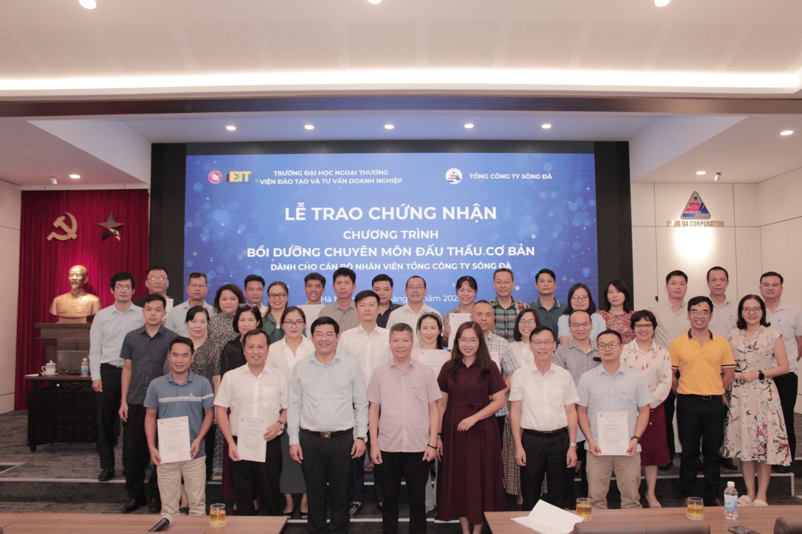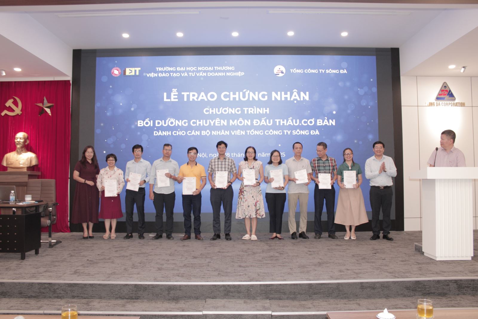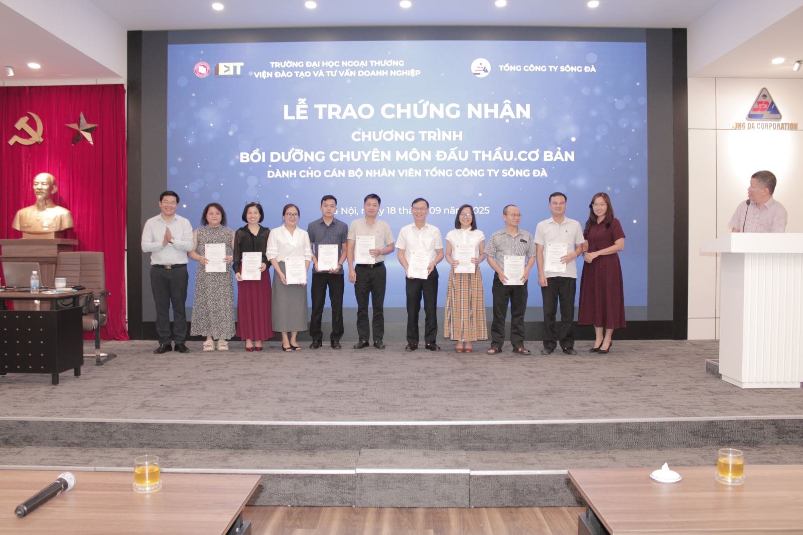 Ngày 18/9/2025, tại trụ sở Tổng công ty Sông Đà (số 493 Nguyễn Trãi, Thanh Liệt, Hà Nội), Tổng công ty Sông Đà phối hợp cùng Viện Đào tạo và Tư vấn doanh nghiệp – Trường Đại học Ngoại thương trang trọng tổ chức Lễ trao chứng nhận chương trình bồi dưỡng chuyên môn đấu thầu cơ bản dành cho cán bộ, nhân viên Tổng công ty.