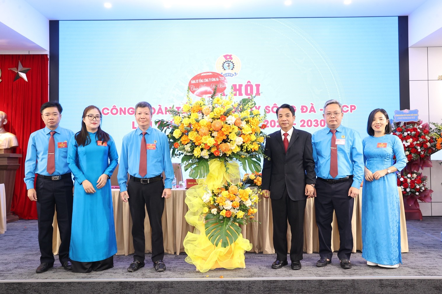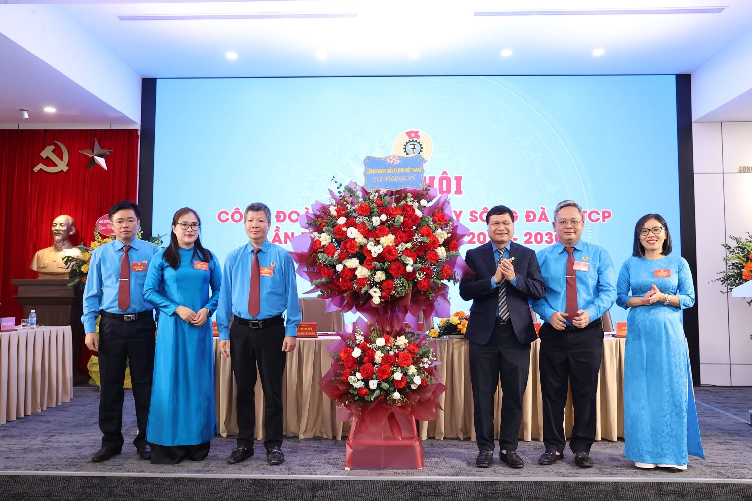 Đ/c Nguyễn Thanh Tùng và đ/c Trần Văn Tuấn tặng hoa chúc mừng Ban chấp hành công đoàn Tổng công ty Sông Đà nhiệm kỳ 2025 - 2030.