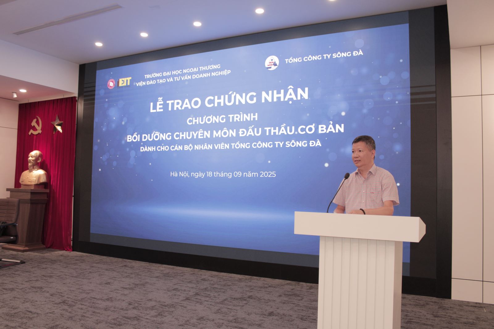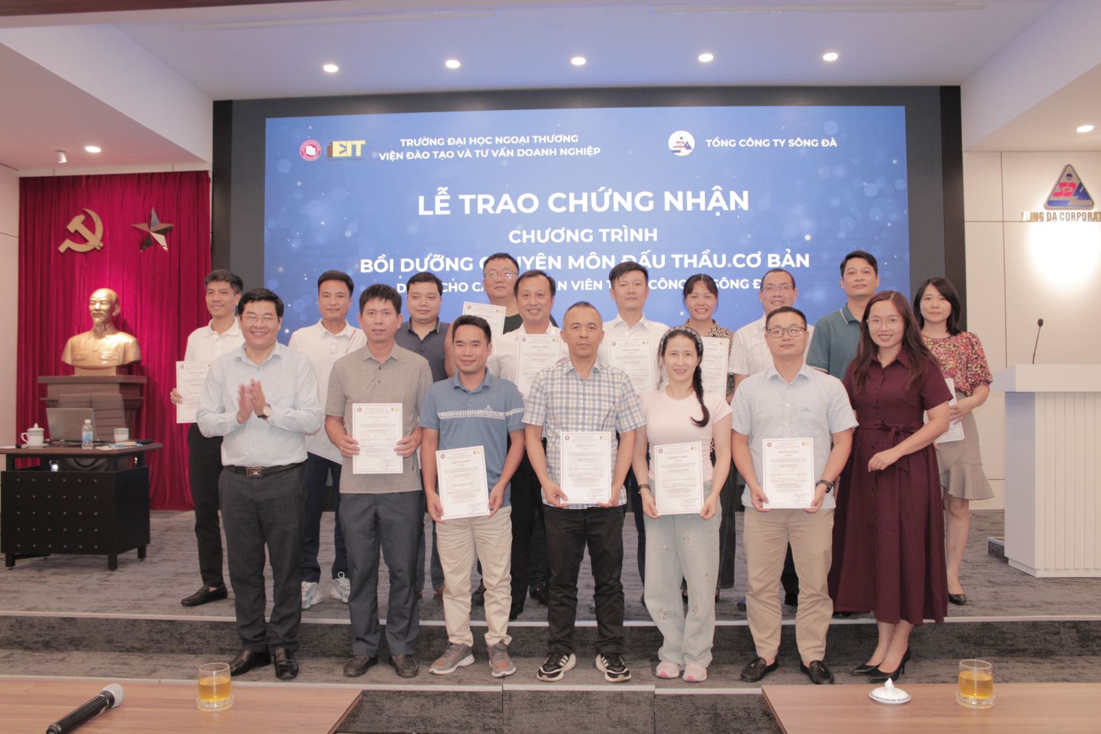 Ngày 18/9/2025, tại trụ sở Tổng công ty Sông Đà (số 493 Nguyễn Trãi, Thanh Liệt, Hà Nội), Tổng công ty Sông Đà phối hợp cùng Viện Đào tạo và Tư vấn doanh nghiệp – Trường Đại học Ngoại thương trang trọng tổ chức Lễ trao chứng nhận chương trình bồi dưỡng chuyên môn đấu thầu cơ bản dành cho cán bộ, nhân viên Tổng công ty.